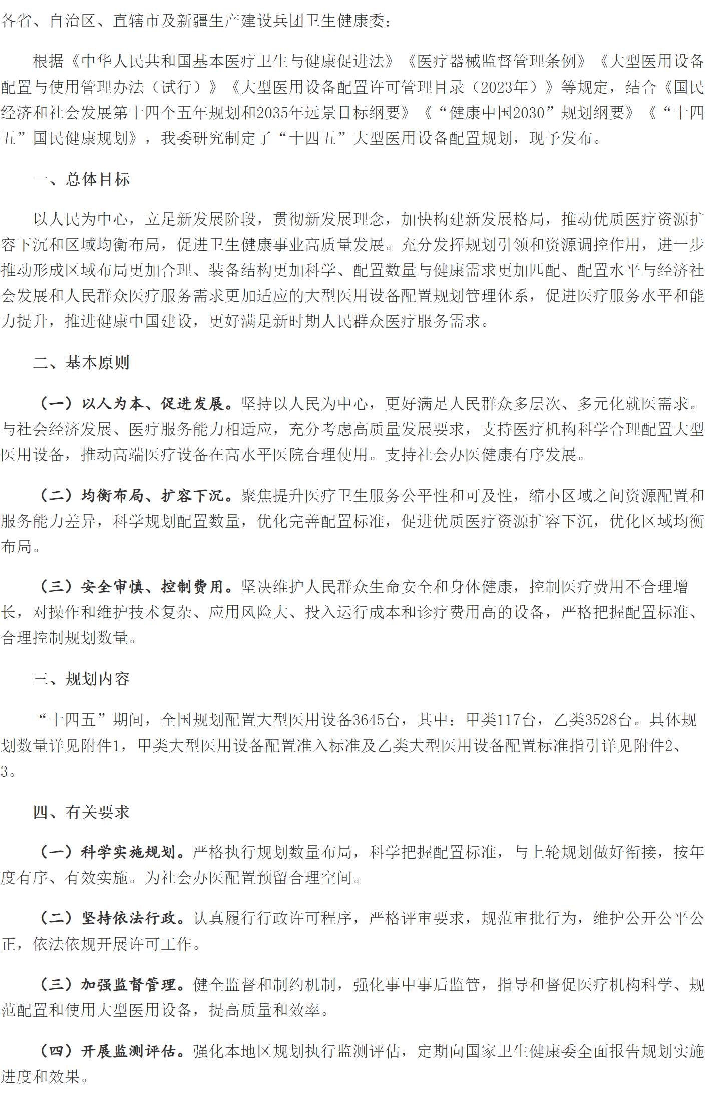 國家衛(wèi)健委:"十四五" 期間全國規(guī)劃配置大型醫(yī)用設備 3645 臺