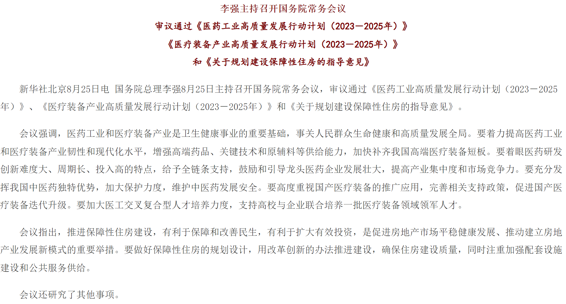 李強主持召開國務(wù)院常務(wù)會議 審議通過《醫(yī)藥工業(yè)高質(zhì)量發(fā)展行動計劃(2023-2025 年)》等